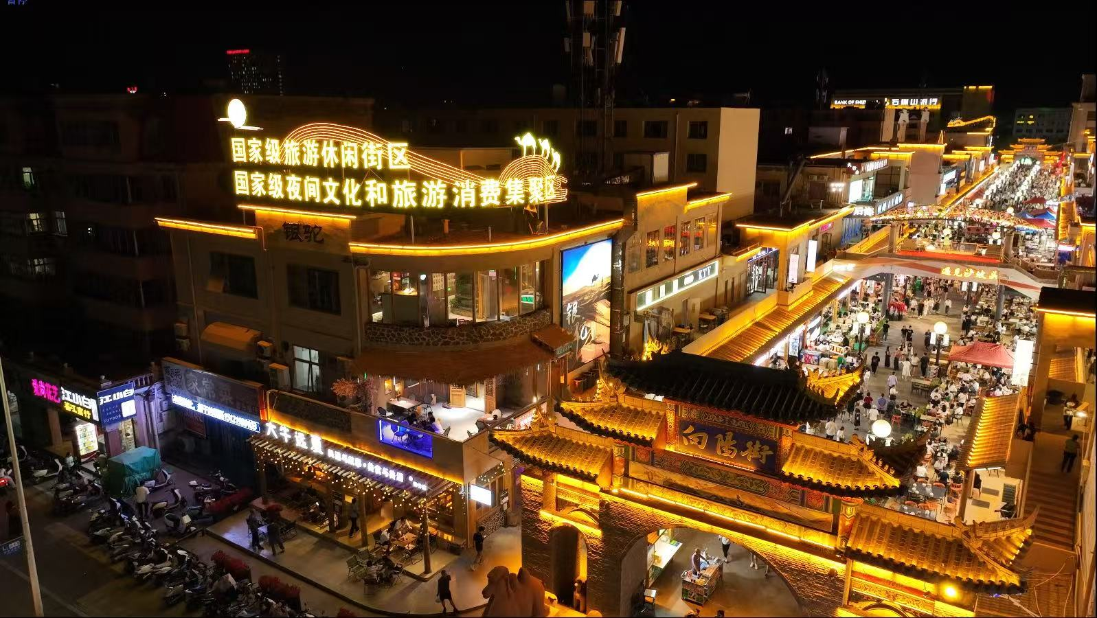 精筑空间载体,全域更新赋能品质升级新标杆。秉持“全景、全业、全时、全民”的发展理念,聚焦基础设施短板精准发力,系统实施硬件提质与软件升级双轮驱动的有机更新。自2021年起,沙坡头区将向阳步行街特色文化街区改造项目列为十件民生实事之一,累计投入资金超3000万元,对建筑立面、艺术装置、街区景观、店招形象及智慧安防系统进行系统性、主题化升级,将文化古迹、非遗民俗、特色美食、地方方言等本土元素融入街区建设,成功输出宁夏首个“大漠味集”特色品牌IP。以“微改精提”推动街区焕新,创新探索“科技+文化+商业”融合模式,精心打造音乐露台、3D全息屏视觉景观、国家级荣誉亮化展示及光影艺术装置,增设智慧街区管理系统,持续优化停车泊位、酒店住宿、环卫保洁、治安防控等配套服务,系统构建“吃住行游购娱”便捷服务生态,全力营造主客共享、宜居宜游的高品质街区环境。2023年,街区成功获评国家级旅游休闲街区、国家级夜间文化和旅游消费集聚区。
