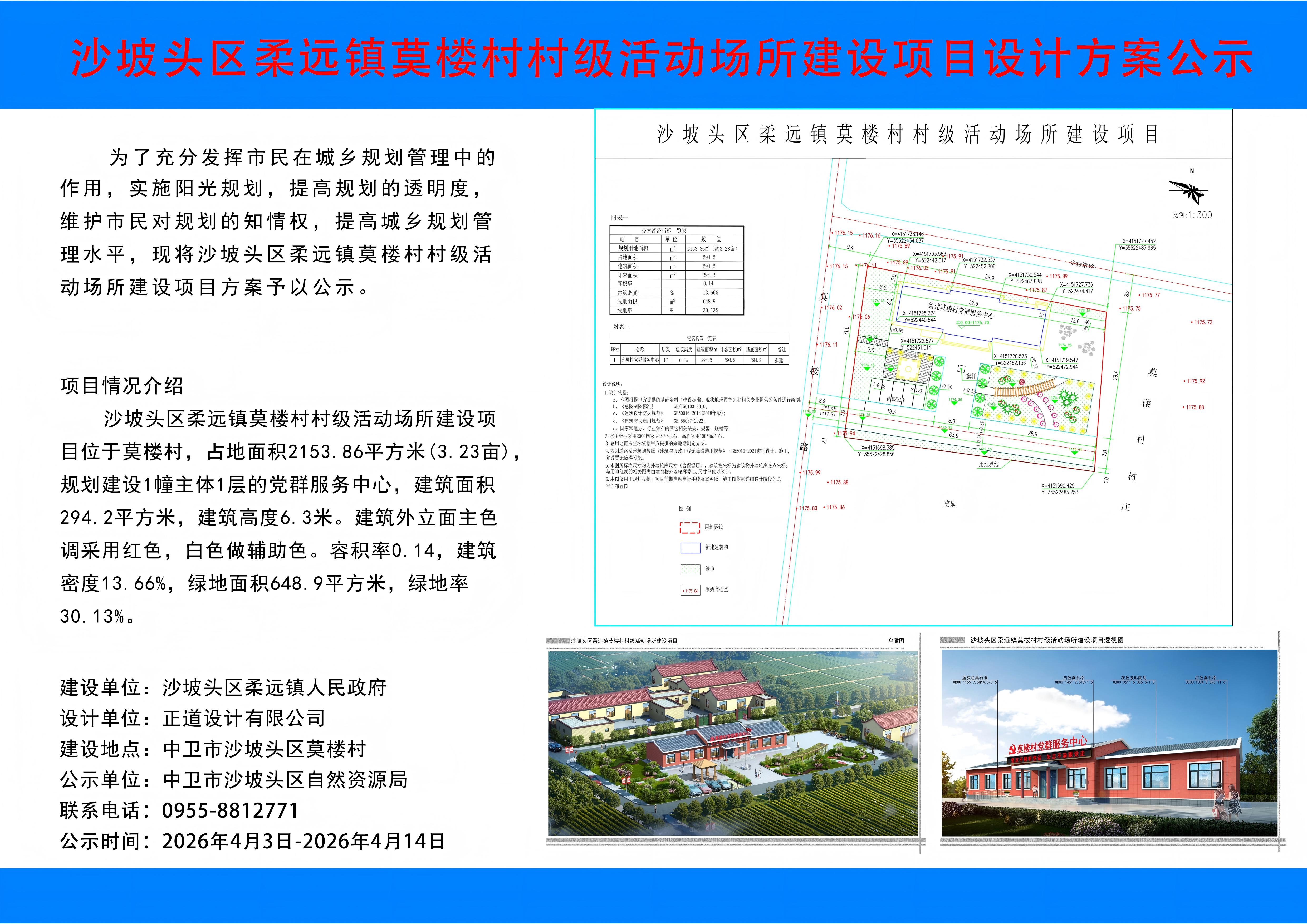 沙坡头区柔远镇莫楼村村级活动场所建设项目设计方案公示