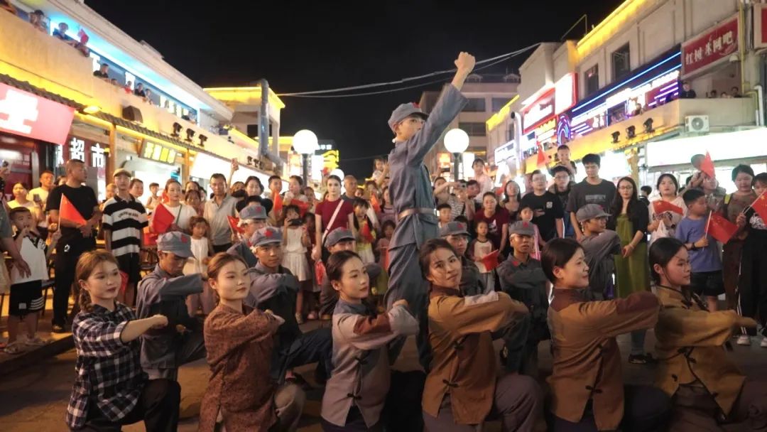 沉浸红色体验:移步换景间触摸历史温度,呼应舞台内核。本次演出紧扣“歌颂中国共产党百年奋斗史、诠释军民鱼水情”的核心主题,将向阳街化作露天剧场,沿街道自北向南铺展连贯红色场景,让观众在漫步中重温峥嵘岁月。从《十送红军》的悠扬旋律拉开序幕,到《映山红》的婉转歌声诉说军民鱼水情;从《血战湘江》的情景演绎重现革命先烈的无畏身姿,到《大刀进行曲》的铿锵节奏点燃全场激情;从《保卫黄河》的壮阔乐章奏响民族救亡的呐喊,到《英雄赞歌》的激昂旋律传递深沉厚重的家国情怀……歌舞、朗诵、情景演绎等多元艺术形式轮番登场,既贴合“自编自演、融合地方特色与时代气息”的节目要求,更营造出“一街尽览峥嵘岁月,步步皆是惊喜”的独特体验。观众在移步换景间恍若穿越烽火年代,直观触摸历史的厚重肌理,让红色文化的感染力在沉浸式体验中自然流淌,生动践行了百姓大舞台“让群众在文化浸润中汲取精神力量”的初衷。