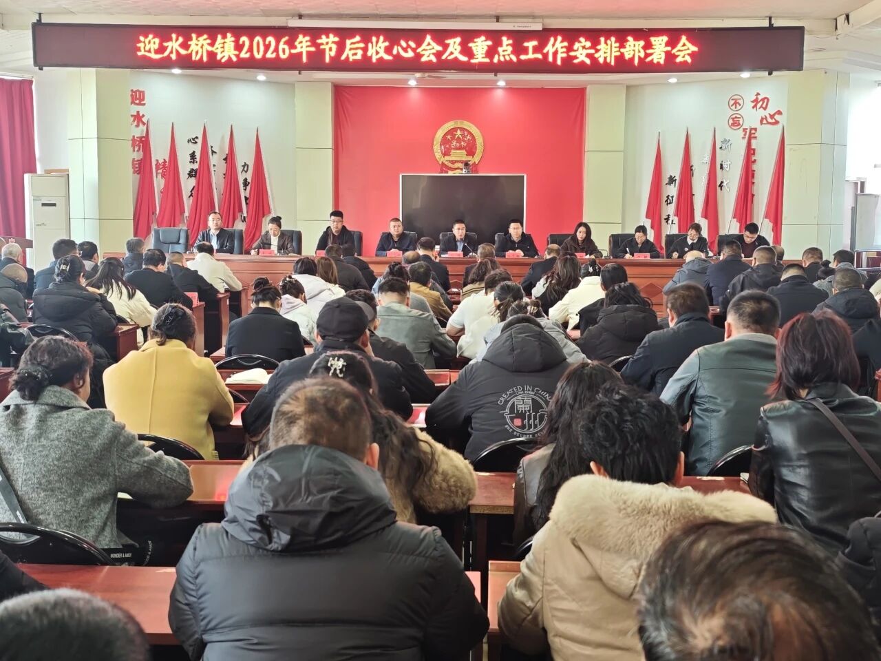春启新程,实干为要。为迅速提振节后干部工作状态,全面部署2026年重点工作任务,确保新一年工作开好局、起好步。2月24日,迎水桥镇召开2026年节后收心会及重点工作安排部署会。镇领导班子成员、在编干部,各村(社区)书记、干部、村监会主任及驻村第一书记等130余人参加会议。