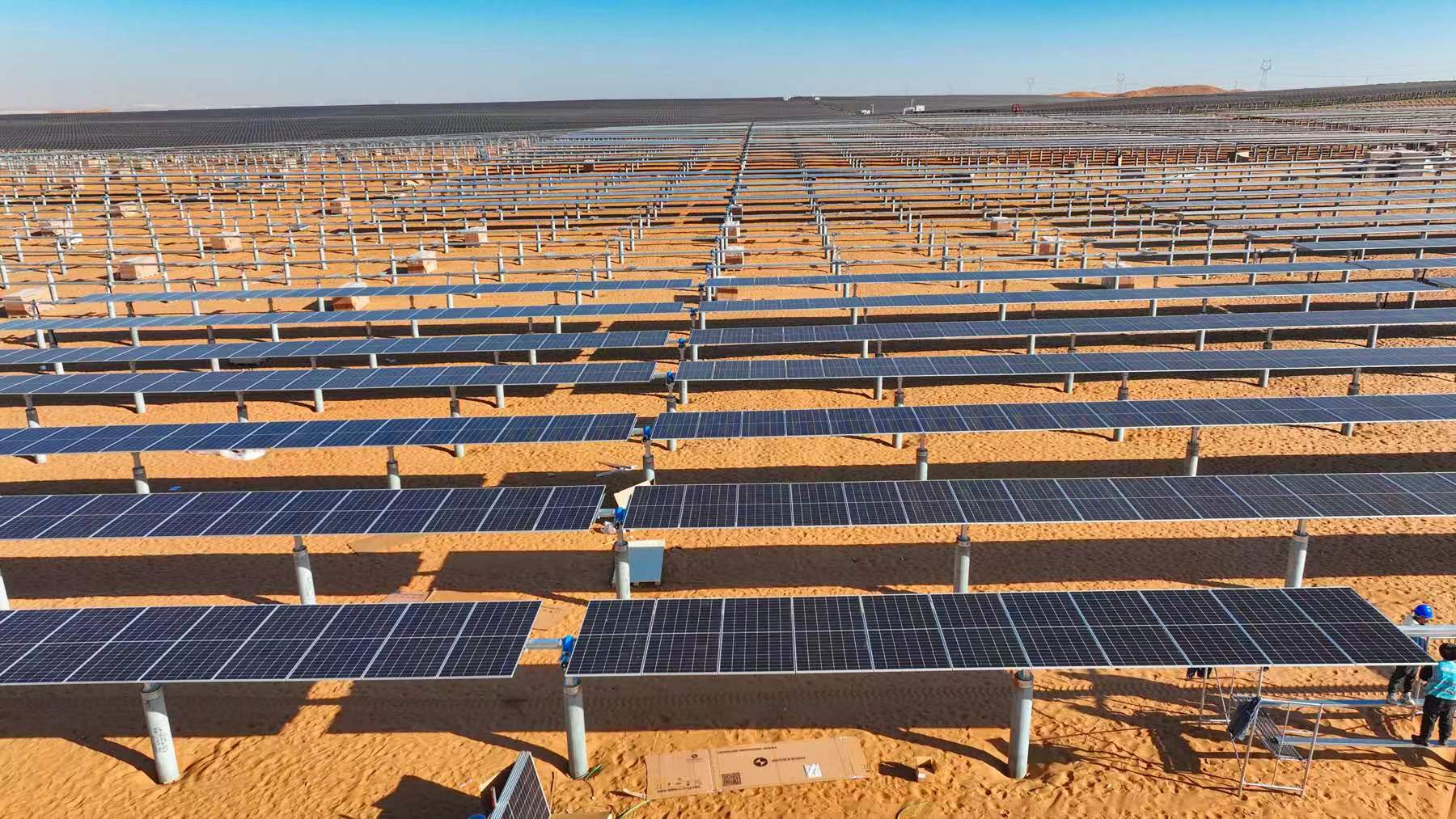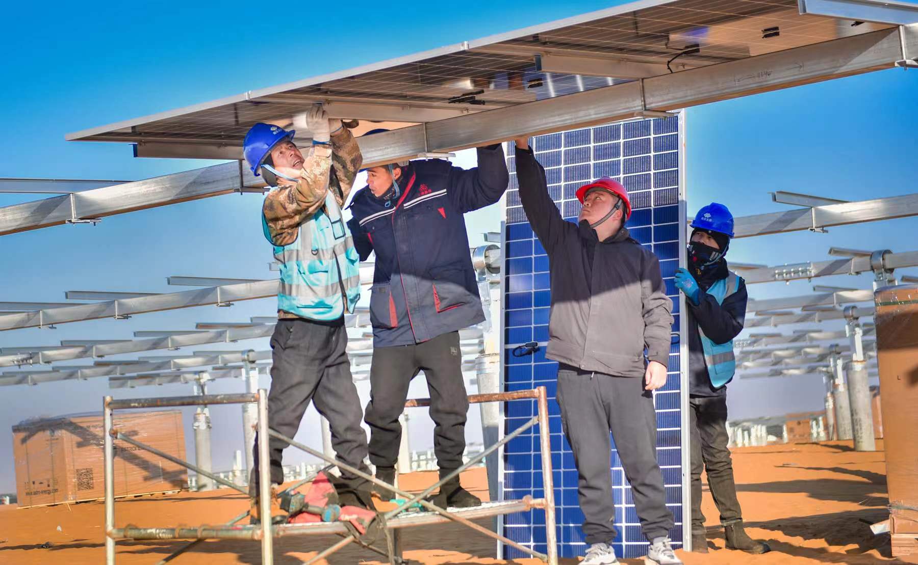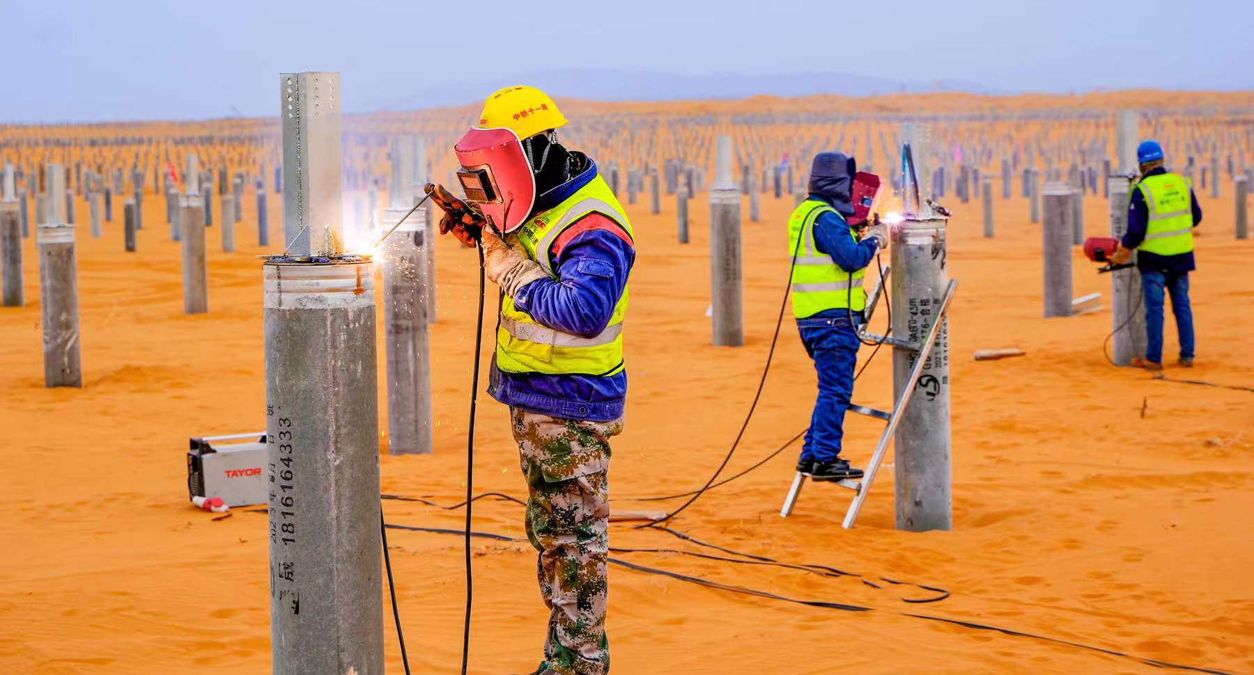打桩、焊接、安装,各类专用机械与工人密切配合,一排排光伏支架组件像阅兵方队一样,在无垠的沙漠中不断扩大阵形。“正在建设的是项目二期200万千瓦的光伏区和一座330千伏升压站,占地面积5.6万亩。”项目经理李超翔介绍,目前施工进度达到50%,要安装200多万块光伏组件,计划8月份完工,投产后年发电量将达到36亿度。