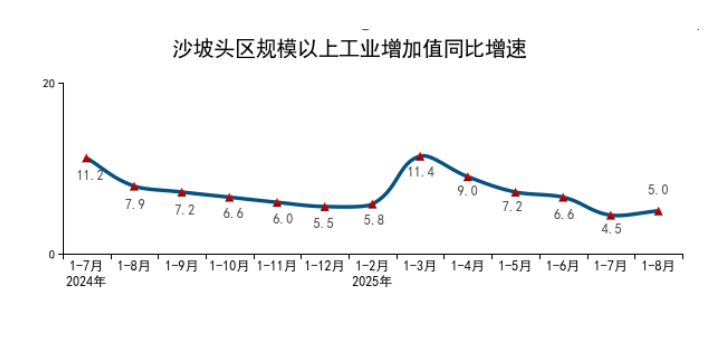 工业运行整体平稳,增长步伐止缓加快。1-8月份,沙坡头区规模以上工业增加值同比增长5.0%,较1-7月份加快0.5个百分点。
