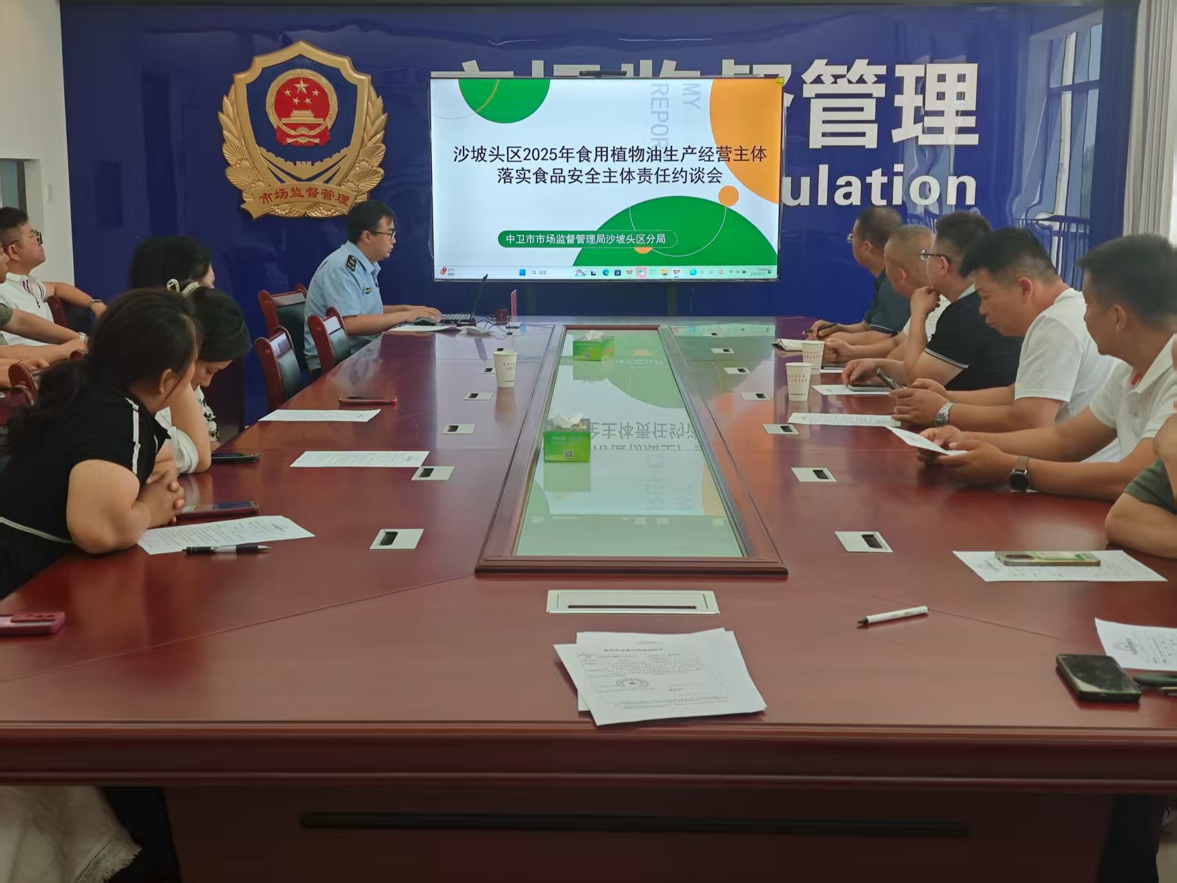 为加强食用植物油质量安全监管,压实生产经营主体食品安全主体责任,维护广大群众身体健康和生命安全。近日,中卫市市场监督管理局沙坡头区分局组织召开2025年食用植物油生产经营主体行政约谈会,辖区食用植物油生产企业、食用植物油小作坊、食用植物油经营企业共计25家负责人参加会议。