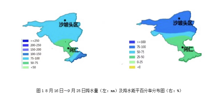 今年6月1日至8月15日,沙坡头区降水持续明显偏少,发生严重夏旱。8月16日以后进入多雨时段,截至9月25日,平均降水量88.8mm,较近30年同期偏多80%,(图1)。