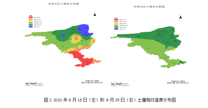 据9月25日土壤墒情监测,与8月15日相比, 0~50cm平均土壤相对湿度明显增加,大部地区旱情解除,土壤相对湿度在60%以上,墒情适宜或较适宜(图2)。