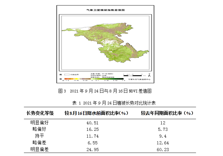 据植被长势卫星遥感监测,截至9月24日,与8月16日降水前相比,由于降水使林草植被恢复生长,干旱带 NDVI(归一化植被指数)增加15.1%;由于秋季林草逐步枯黄及作物成熟收获,南部山区NDVI减少2.6%(图3)。整体来看,与8月16日降水前相比,56.8%的区域植被长势明显好转(表1)。