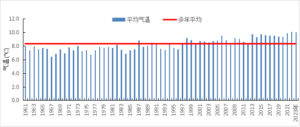 2023年沙坡头区平均气温10.0℃,较常年偏高1.7℃,为1961年以来第2高值(图1)。沙坡头城区、兴仁镇国家气象站平均气温分别为10.8℃、9.2℃,较同期偏高1.1℃、1.4℃,其中沙坡头城区为1961年以来第1高值,兴仁镇为第2高值。