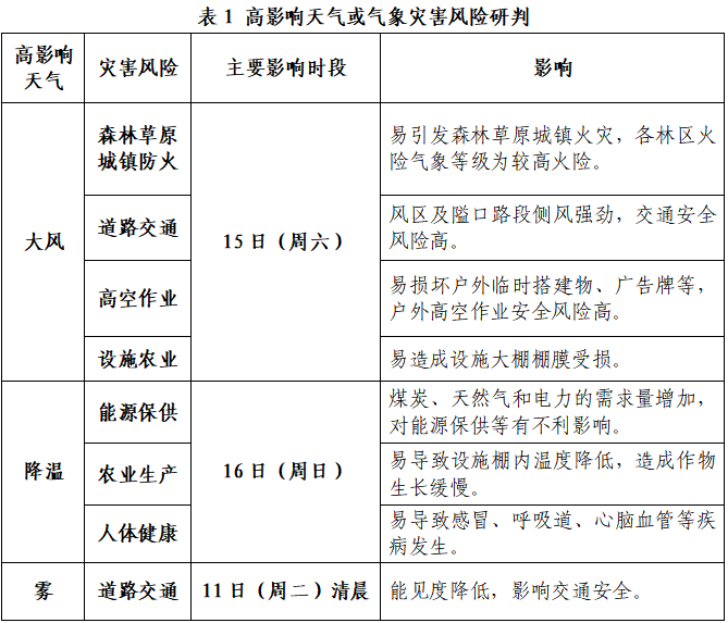 11日清晨雾天对道路交通有不利影响;15日风力较大,对户外高空作业、森林草原城镇防火、设施农业等有不利影响;16日气温下降,对能源保供和人体健康等有一定不利影响。