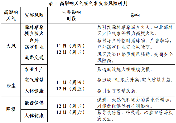 11到12日将出现大风并伴有沙尘天气,12日气温下降明显,上述天气对森林草原城乡防火、能源保供、道路交通、设施农业、人体健康等有不利影响。