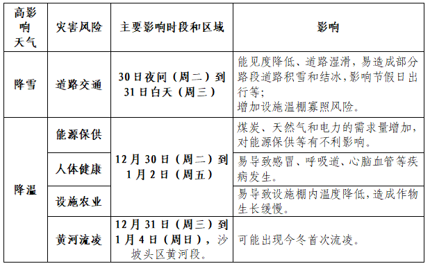 降雪、降温天气过程对道路交通、设施农业、能源保供、人体健康、黄河凌汛等有不利影响。
