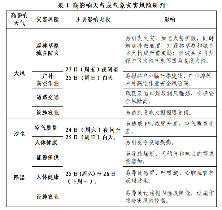 大风:23日夜间,有4~5级偏南风,阵风6~8级;24日白天到25日白天,有4~5级南转北风,阵风7~9级,并伴有沙尘天气(能见度3~9千米)。