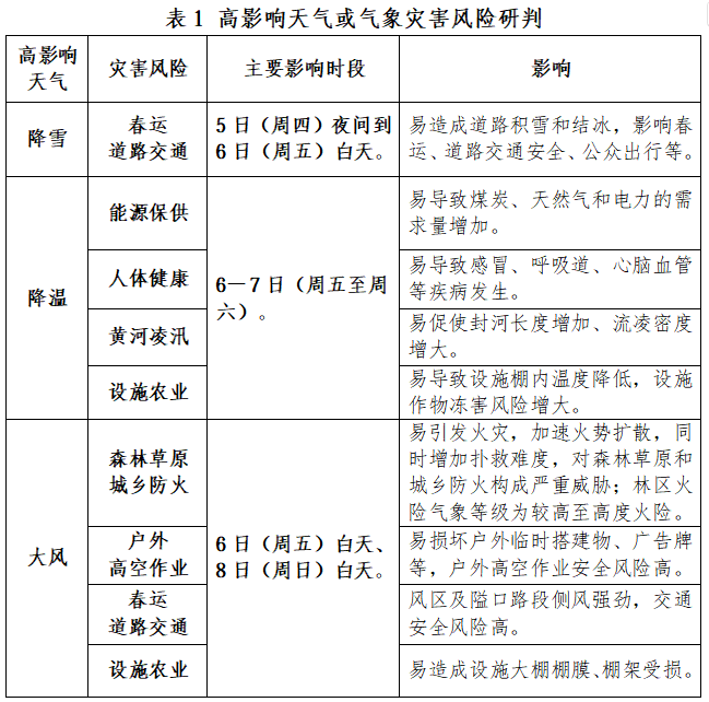 5-6日迎水桥镇、香山乡、常乐镇有降雪,对春运和道路交通安全有不利影响;6-7日降温对能源保供、人体健康、黄河凌汛、设施农业有不利影响;6日和8日大风对森林草原城乡防火、户外高空作业、春运和道路交通、设施农业等有不利影响。